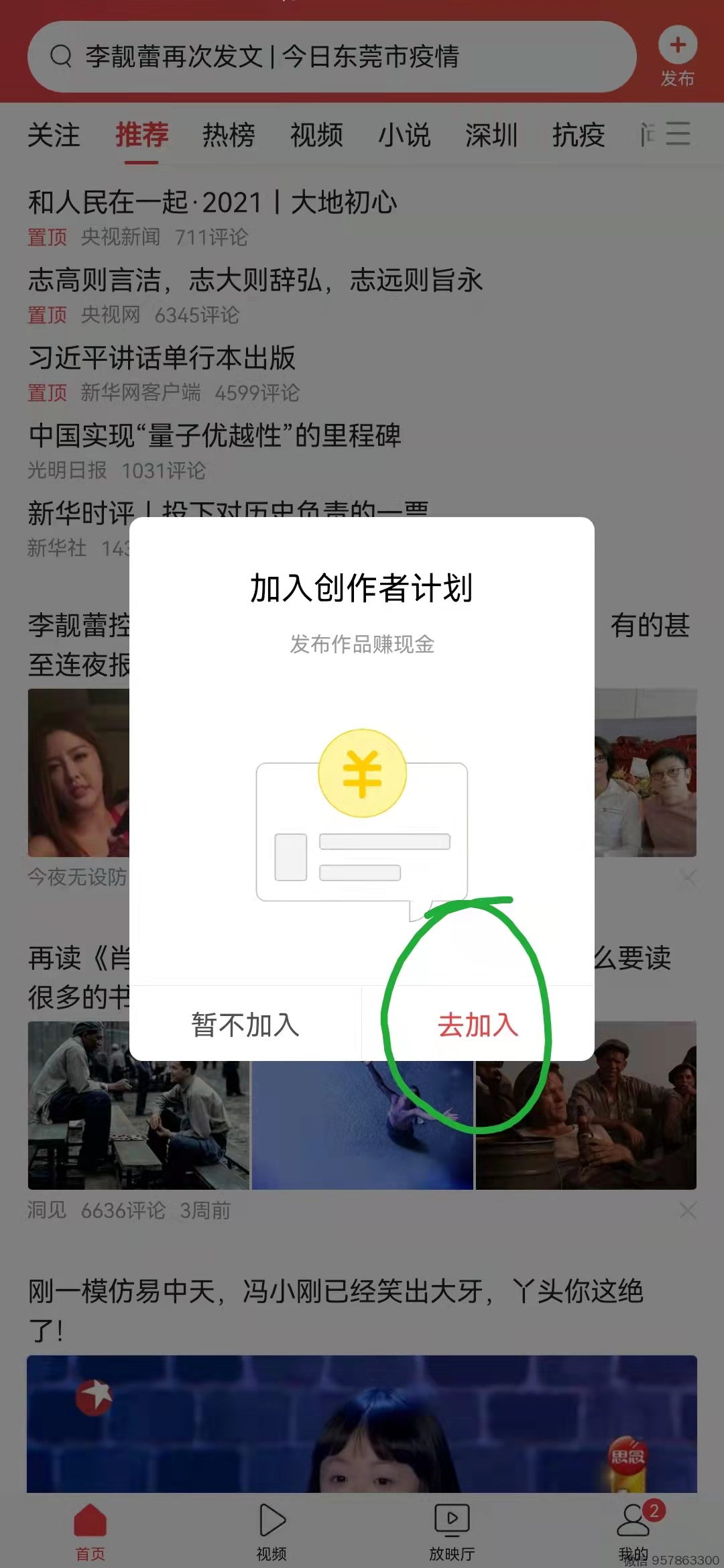 3、随便发一条内容 ,会提示你,开始「赚钱权益」,点「去加入」